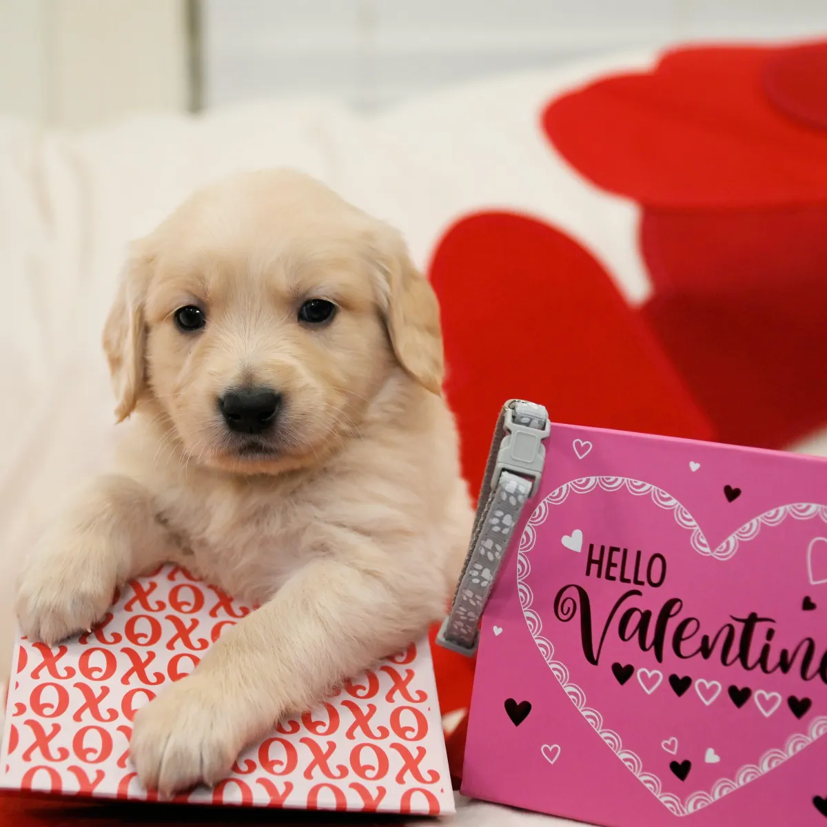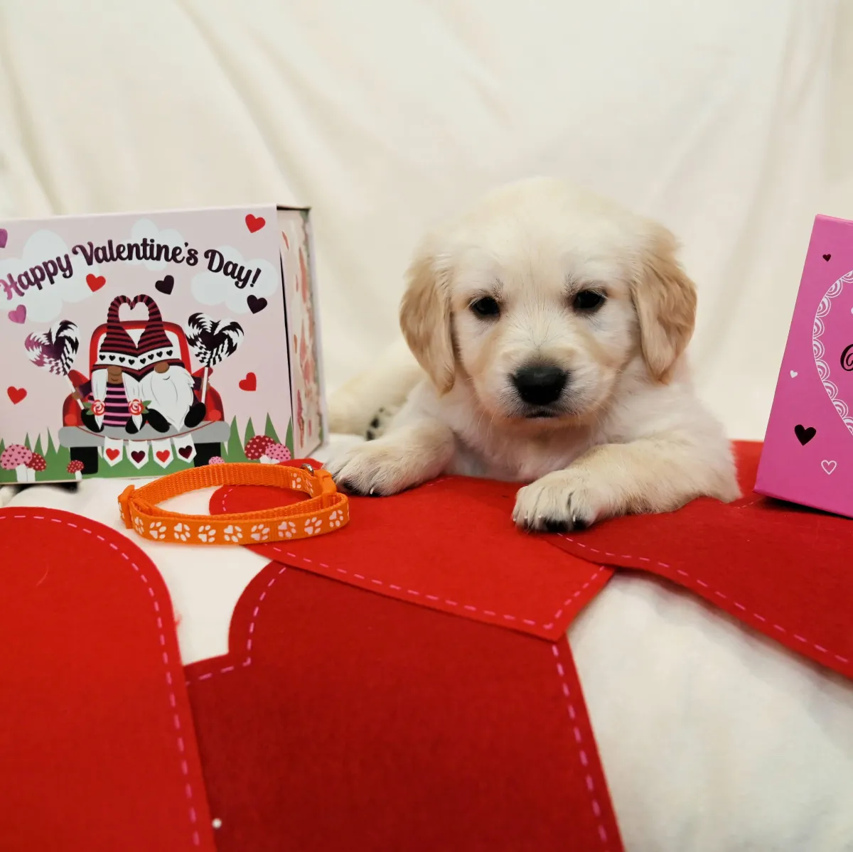 All puppies go home with a swag bag full of goodies that include an age appropriate harness, a seat belt for the vehicle, toy, blanket, and current food/kibble they are eating.